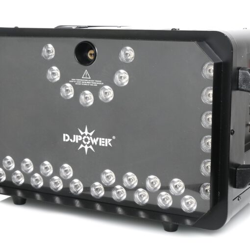 2200-Watt-Bodennebelmaschine, die für 200 m² große Bühnen nur Wasser benötigt, kein CO2 oder Trockeneis. DMX 512, ferngesteuerter LCD-Bildschirm, 2 DMX-Kanäle, Aufheizzeit 3,5 Min., Flüssigkeitsverbrauch 1–60 ml/Min., Trockenlaufschutz, Selbstreinigungsfunktion.
